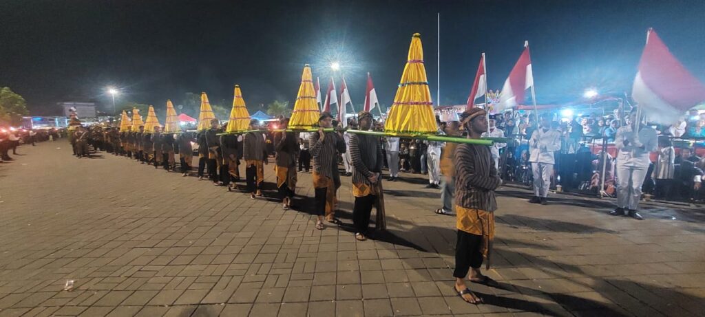 Demak – Ribuan warga Demak padati perhelatan tradisi budaya Kirab Iring²anTumpeng Songo dan 90 \”Sangang Puluh\” Gunungan Hasil Bumi yang diarak dari Pendopo Demak hingga Masjid Agung, Minggu (16/6/24).